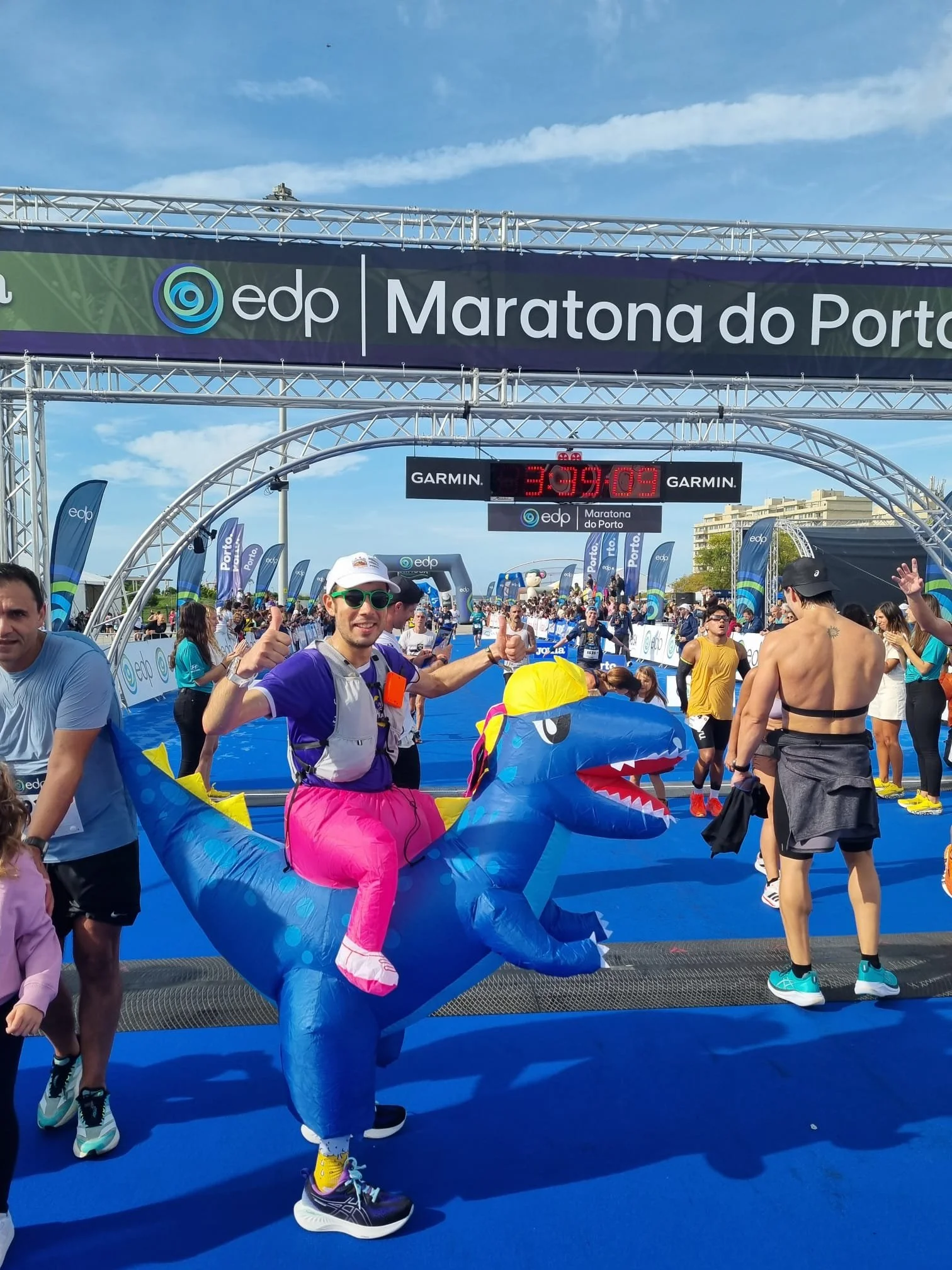 The last stretch toward the finish line felt like a huge celebration. At the arrival zone: food, snacks, beer, smiles… pure joy. And yes, I crossed the finish line as a dinosaur. Not everyone can say that.